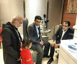 وزیر بهداشت، درمان و آموزش پزشکی چشمان "ستایش" را معاینه کرد تا وعدهای که فرشادان در سفر به روستای «آخکند» از توابع شهرستان دیواندره به پدربزرگ این دختر خردسال داده بود، محقق شود.