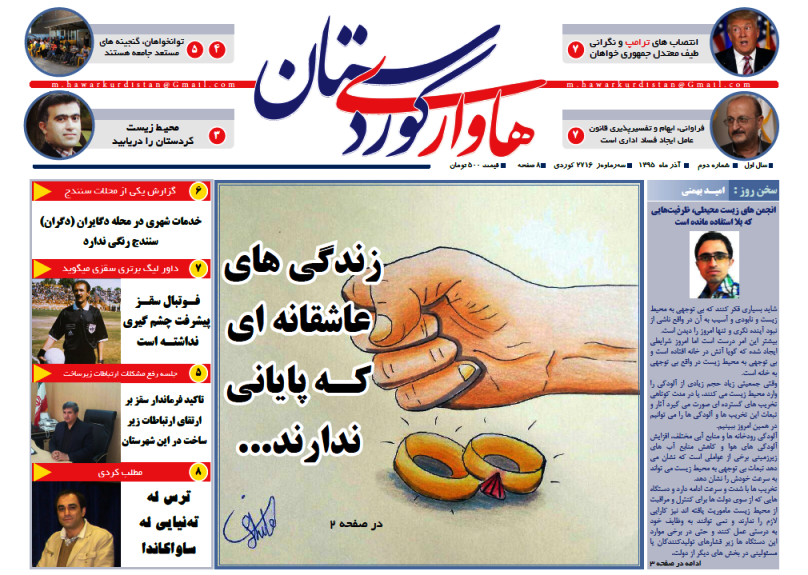در این شماره موضوعاتی با عناوین “محیط زیست کردستان را دریابید”، “فراوانی، ابهام و تفسیر پذیری قانون عامل ایجاد فساد اداری است”، “انتصاب های ترامپ و نگرانی طیف معتدل جمهوری خواهان”، “انجمن های زیست محیطی، ظرفیت هایی که بلا استفاده مانده است”، “زندگی های عاشقانه ای که پایانی ندارد”، ” خدمات شهری در محله دگایران سنندج رنگی ندارد” ، “فوتبال سقز پیشرفت چشم گیری نداشته است”، “ترس ته نیایی له ساواکاندا”، “سونامی طلاق فرجام بلند پروازی ماست”، “ارائه گواهی آموزش پیش از ازدواج”، “هیچ وقت به ضلع سوم در زندگی نباید اعتماد کرد”، “عواملی که آخرین نفس های محیط زیست را می گیرد”، “تهدیدات زیست محیطی در کردستان”، “هورامان به ثبت جهانی نزدیک می شود”، “گزارش کامل از فعالیت های بهزیستی سقز در حوزه معلولان”، “اقتصاد مقاومتی مسبب کاهش کیفیت زندگی نیست”، “ساماندهی دست فروشان قروه در هاله ی از ابهام”، “قاچ چهارم دیواندره رای آور است”، “نقش مدیریت شهری و استراتژیک در توسعه”، “طنز نه هات”، “گندم و اهمیت اقتصادی آن”، “افق های روشن برای کردستان” و مطالب دیگری در حوزه های مختلف منتشر شده است.