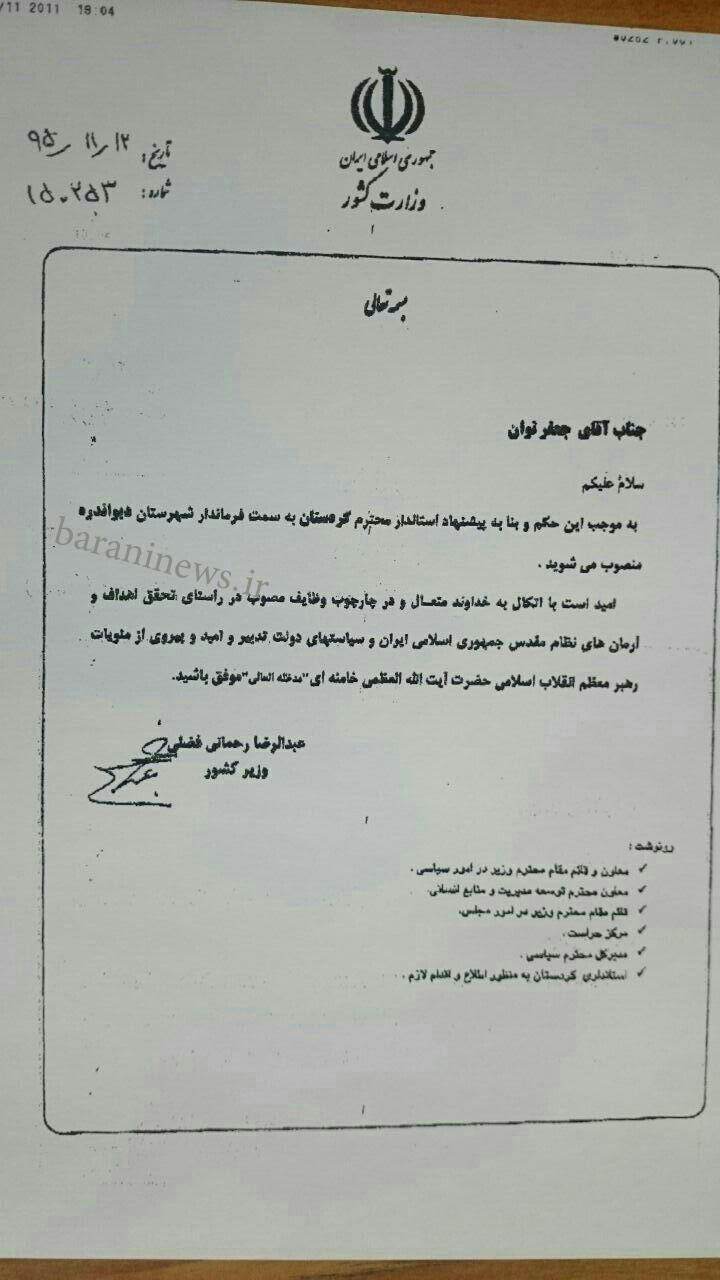 به گزارش بارانی خبر، وزیر کشور با صدور حکمی جعفر توان را به عنوان فرماندار شهرستان دیواندره منصوب کرد.