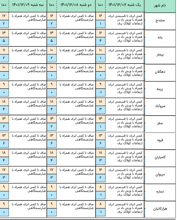 بولتن پیش بینی اداره کل هواشناسی استان کردستان از تاریخ ۵ اسفند تا ۹ اسفند ۱۴۰۱ به شرح زیر است